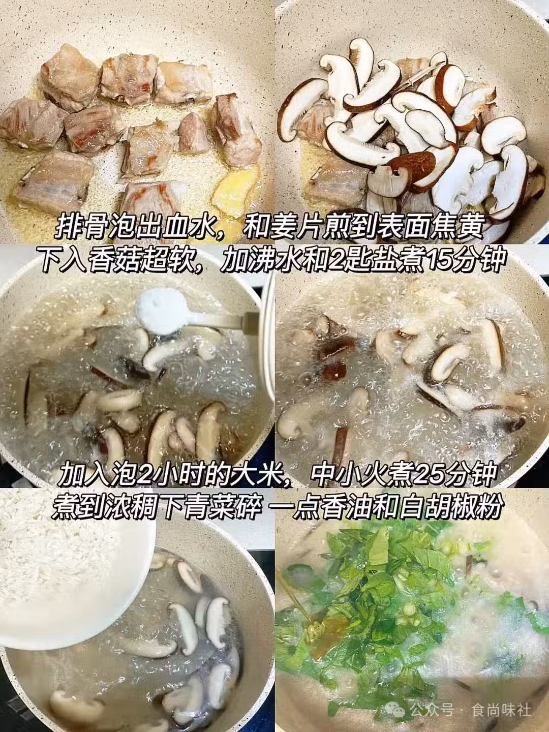 口感豐富,排骨經過煎制後外焦里嫩,香菇的加入為菜品增添了濃郁的香氣和滑嫩的口感,大米則充分吸收了湯汁的精華,變得軟糯可口。青菜的碎末為整道菜帶來了清新的口感,而香油和白鬍椒粉的調味則提升了整體的鮮美度,讓人回味無窮。 補鈣健骨:排骨是鈣質的良好來源,冬季喝香菇排骨粥有助於補充身體所需的鈣質,對維護骨骼健康非常有益。 滋補養生:香菇排骨粥融合了排骨和大米的營養,具有滋補養生的功效,特別適合在寒冷的冬季食用,能夠溫暖身體,提供充足的能量。