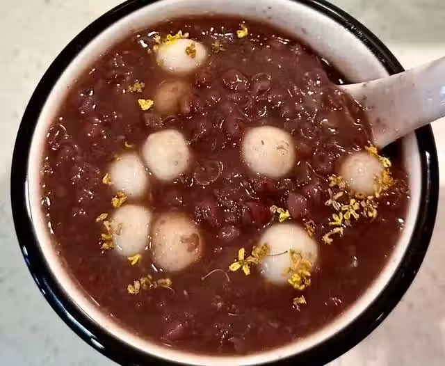 食材:紅豆提前泡一晚上、小圓子、水澱粉(就是澱粉加點水調稀)、冰糖、桂花