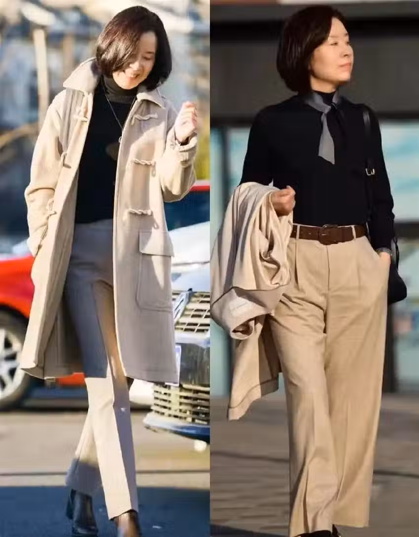 下半身搭配白色的卡布里褲,白色有效避免了棕色圓領衫的沉悶與枯燥,為中年女人的秋冬穿搭帶來了清新感。