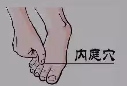 腳上有個滅火開關」它就是內庭穴,它位於在足的次趾與中趾之間,腳趾縫盡處的陷凹中。《難經·六十八難》中指出:「滎主身熱。」說明滎穴主要應用於發熱病症。內庭穴是治療胃部疾病最好的穴位,可以祛除胃部上火症狀,有很好的療效,中醫們都說是胃部上火的剋星。凡是胃火引起的牙痛、咽喉痛、鼻出血、口臭、胃酸、便秘都可以按摩內庭穴。按摩內庭穴祛熱、祛胃火效果非常好。