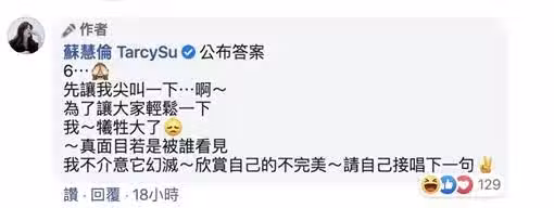 過了一陣子後,她才公布答案,表示第6項是假的,其他都真實發生過,讓她直呼「先讓我尖叫一下...啊~為了讓大家輕鬆一下,我犧牲大了,真面目若是被誰看見,我不介意它幻滅,欣賞自己的不完美,請自己接唱下一個」,但讓網友驚訝她竟然曾進過警察局,掀起一陣討論。