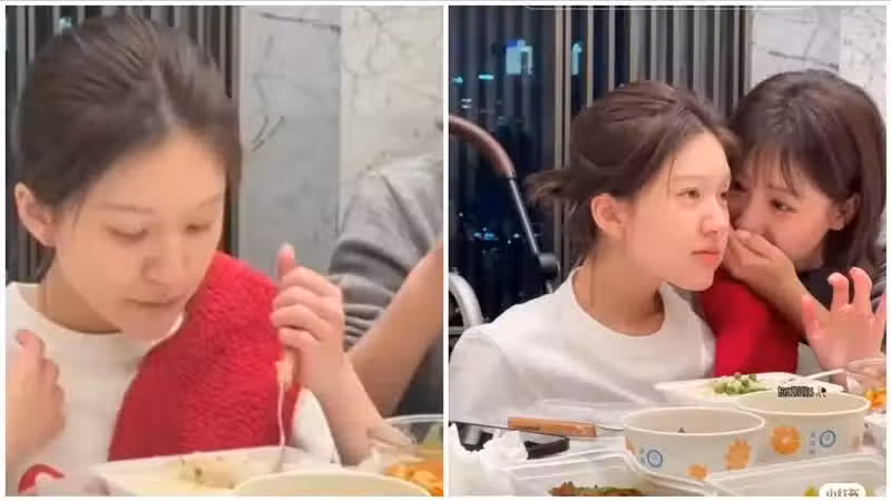 ▲趙露思握著湯匙的手指相當僵硬,像極了剛學吃飯的幼童。(圖/翻攝趙露思抖音)