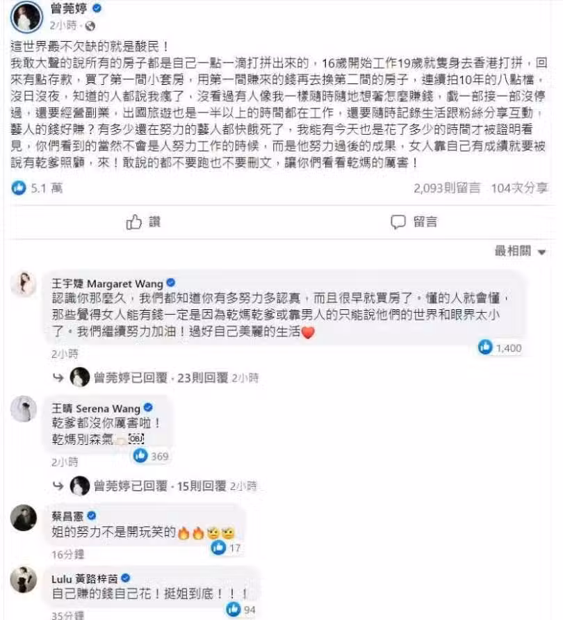 而對於那些質疑她的聲音,曾莞婷毫不畏懼,直言:「女人靠自己有成績就要被說有「乾爹」照顧?來吧,我要讓你們看看乾媽的厲害!」儘管平日溫婉的她此次罕見地動怒,但她的反擊獲得了廣泛的支持。不到一小時的時間,她的社交媒體帖子便獲得了超過2萬名粉絲的點贊,評論區也充滿了聲援。