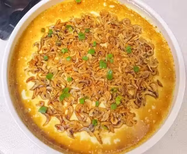 4、熱油鍋里倒入適量蝦皮,翻炒變色,立馬倒入雞蛋羹上,淋上少許蒸魚豉汁,撒上蔥花即可。每一口蒸蛋都像雲朵般輕盈,裹挾著蝦皮的咸香,滑嫩與鮮美在舌尖交織,瞬間征服味蕾!拌著米飯吃,真的好下飯!