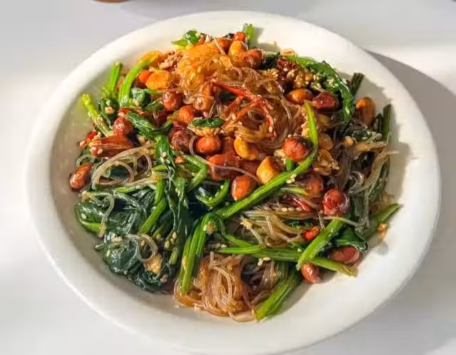 4、把煮好的粉絲和菠菜加入碗中,加入炒好的花生米,再輕輕翻拌,確保每一根粉絲、每一片菠菜都被調味料均勻包裹。這樣一來,菠菜的清香、粉絲的柔軟、花生的脆口,所有味道在口中交織,恰到好處。