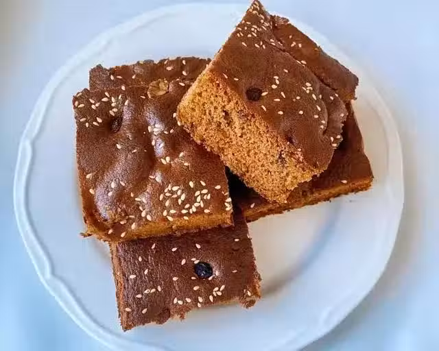 食材:低筋麵粉160克、去核紅棗肉150克、玉米油80克、泡打粉5克、食用鹽2克、紅糖100克、雞蛋6個、水200克、適量芝麻、葡萄乾