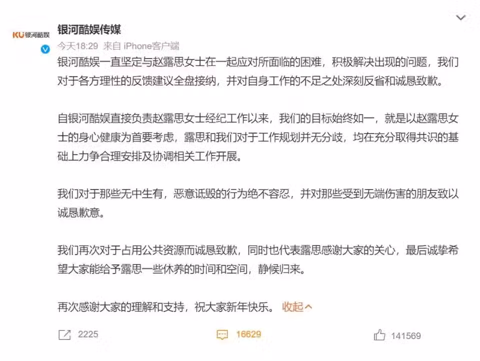 趙露思長文發布後,一直隱身的經紀公司也站出來發聲了,除了強調雙方沒有分歧、合理安排工作,也用「靜候歸來」四個字,表達了不會解約立場,態度很明顯了:你想玩我就陪你玩,你想養病可以,想解約沒門,除非起訴解約賠償公司損失。