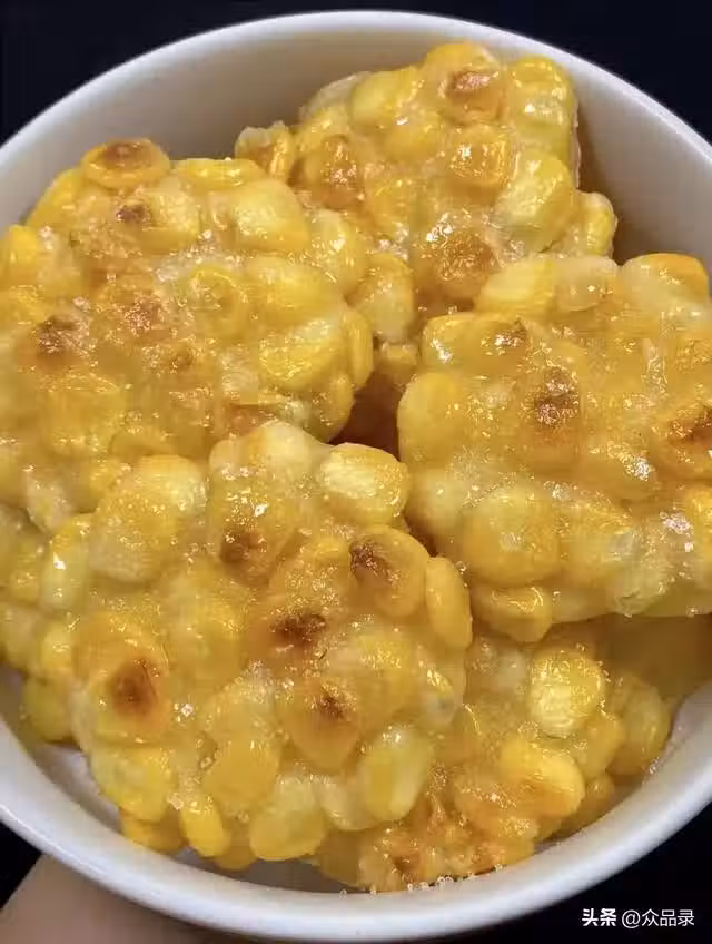 3. 鍋中倒入適量油,油熱後倒入玉米粒,用鏟子將玉米粒攤平,小火煎至底部金黃,然後翻面,繼續煎至另一面金黃,即可出鍋,切成小塊裝盤。