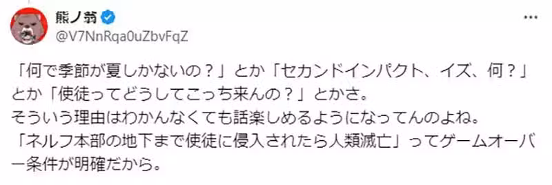 「即便NERF的員工或其他人類們,在暗地裡搞一些莫名其妙的事情,表面上依然維持著『打爆使徒!不擇手段!』這個淺顯易懂的目標。所以即便相關設定充滿了謎團,觀眾還是能夠看下去,深受這個世界之謎所吸引啊。」