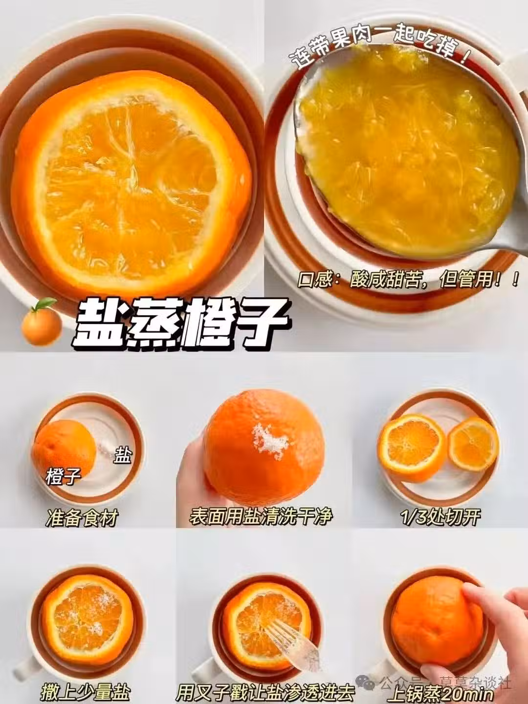 味道及功效:橙子的清甜帶著一點點咸,能潤喉止咳、清熱化痰。中醫認為,橙子性涼,配上少量鹽蒸煮後,能增加潤燥化痰的效果。