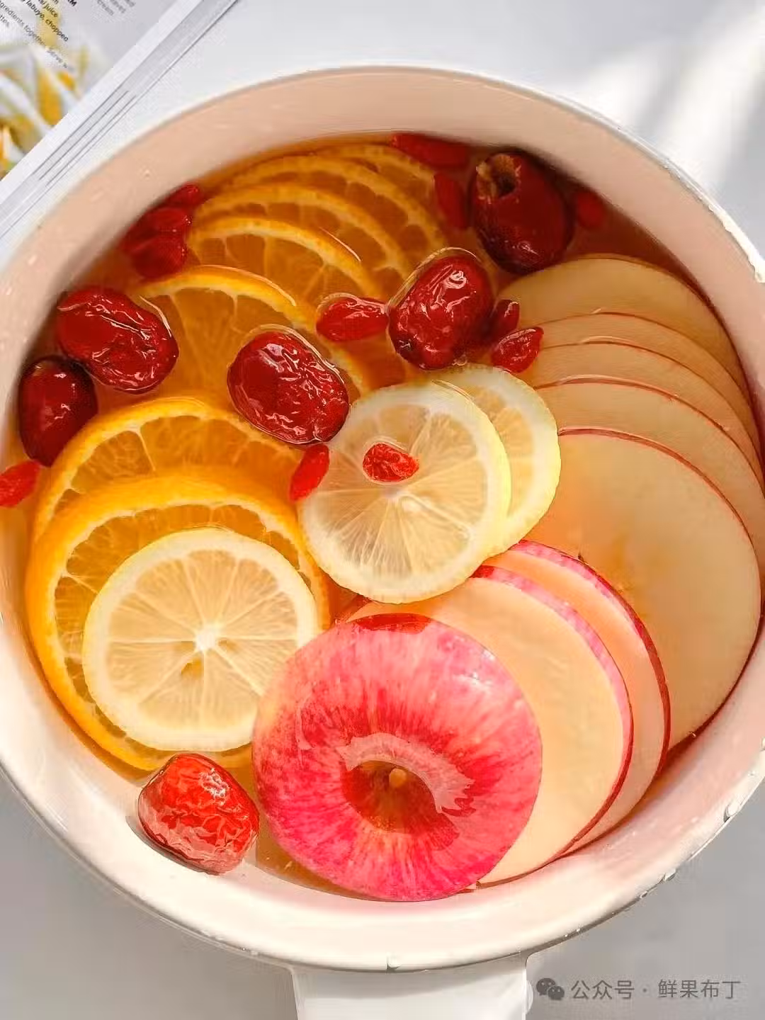 蘋果1個、橙子1個、檸檬3片、紅棗6個、枸杞 5g
