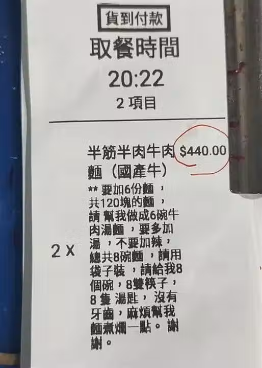 」此外,該名客人繼續獅子大開口,要求店家提供8個碗、8雙筷子跟8個湯匙,甚至提到,自己沒有牙齒,麻煩面要煮爛一點。