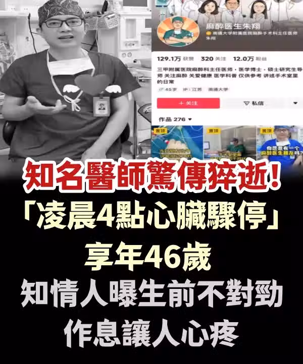 知名醫師驚傳猝逝,享年僅46歲!凌晨4點心臟驟停,知情人透露,生前的作息狀況不容忽視