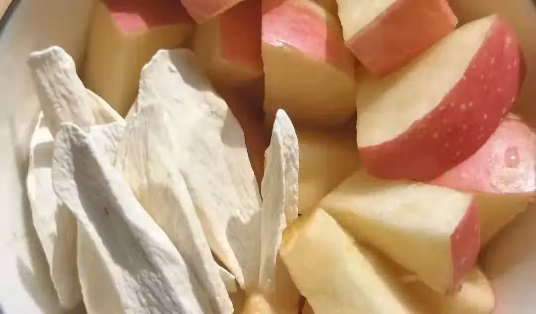 做法:蘋果切塊,跟干山藥片,一起煮半個小時。