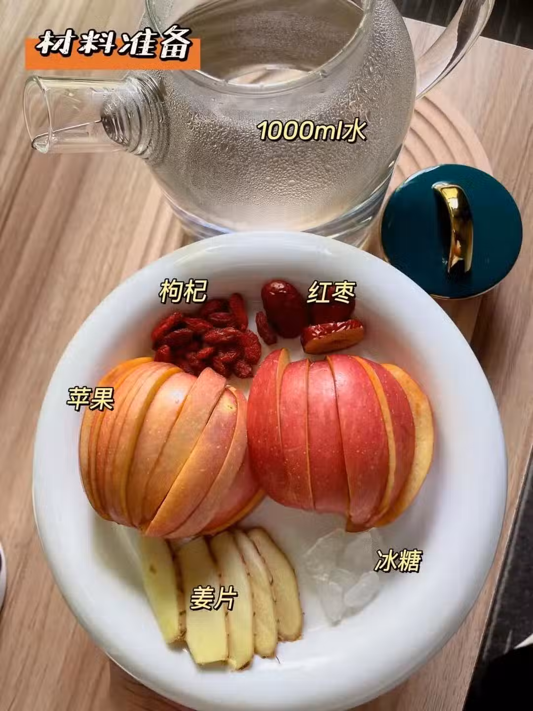 1. 準備食材:將蘋果、姜和紅棗切片,準備好枸杞和冰糖。
