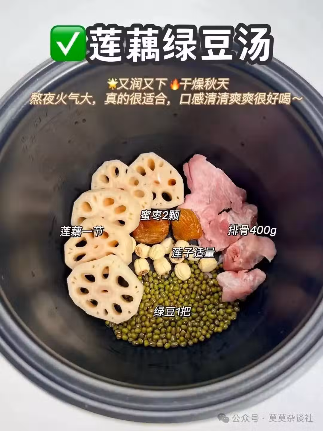 味道及功效:綠豆的清熱解毒屬性,配上蓮藕的潤燥功效,簡直是秋冬「降火神器」。喝完清熱祛燥、養心安神,特別適合熬夜後火氣大的人。