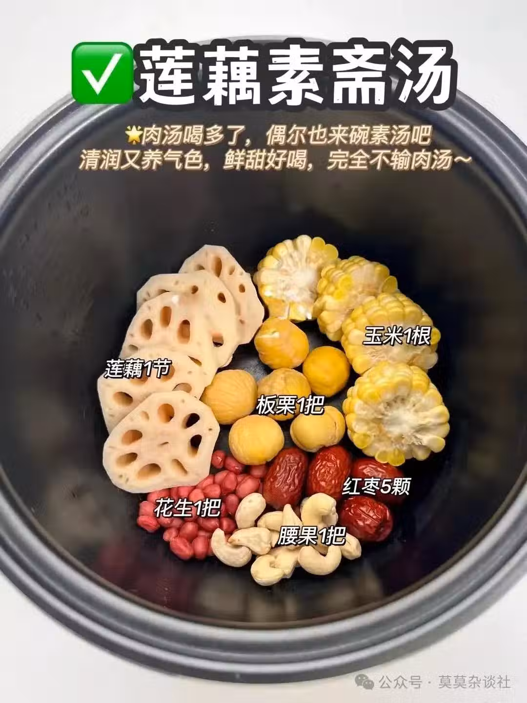 味道及功效:這款湯是素食者的福音!蓮藕的粉糯、板栗的甜香、腰果的油脂感,潤膚養顏、補中益氣,喝完心情都會變好。