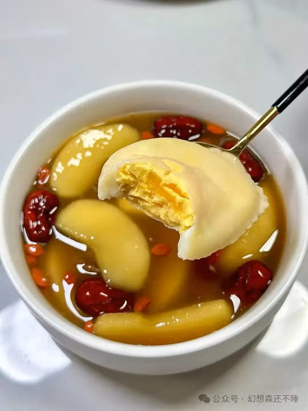 蘋果1個,雞蛋1個,紅棗6個、枸杞適量、桂圓6個、水適量,紅糖適量。