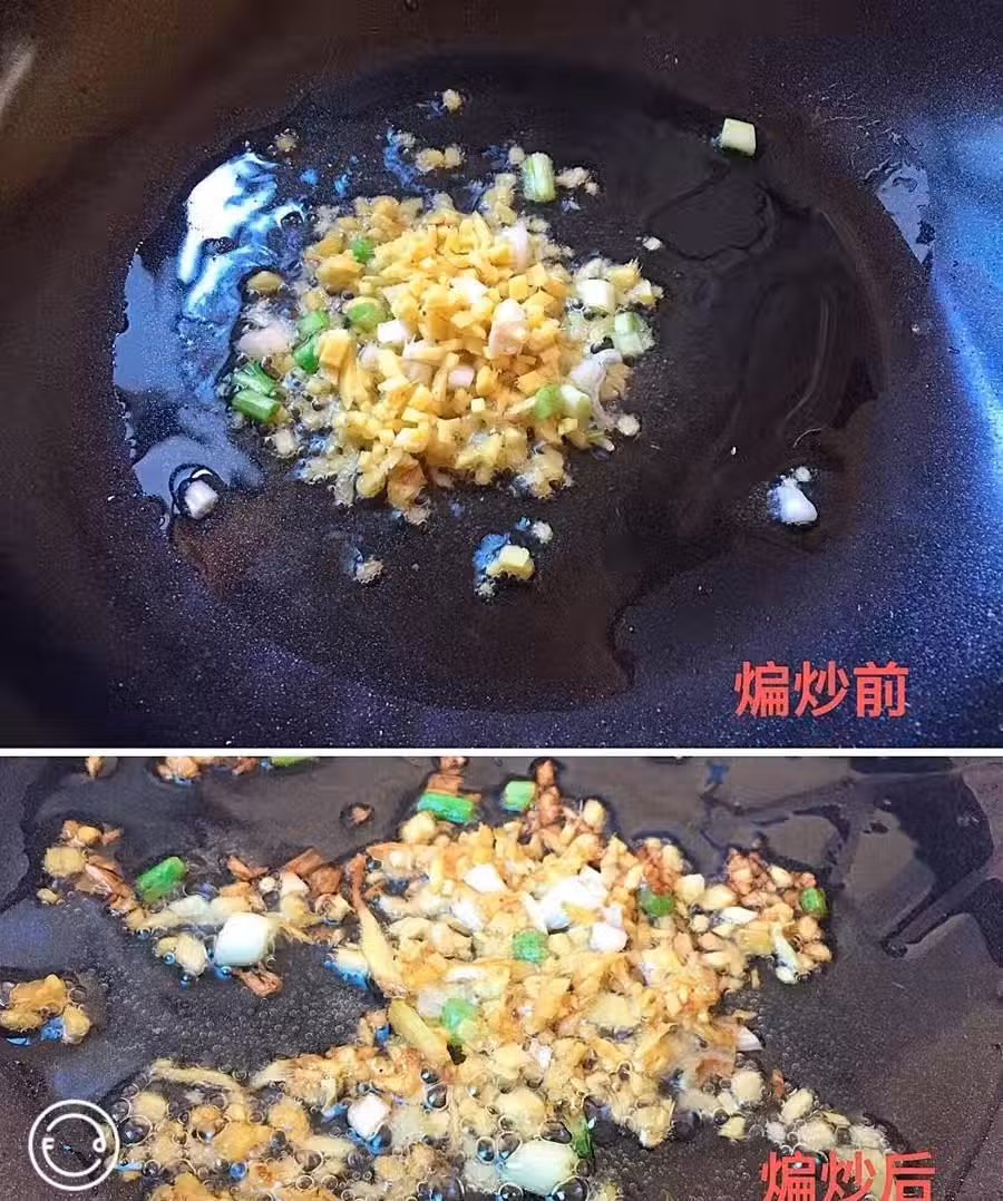 第三步:起鍋燒油,將薑末和蔥頭部分放入煸香,小火慢煎哦,煎至姜慢慢變成焦黃色即可。