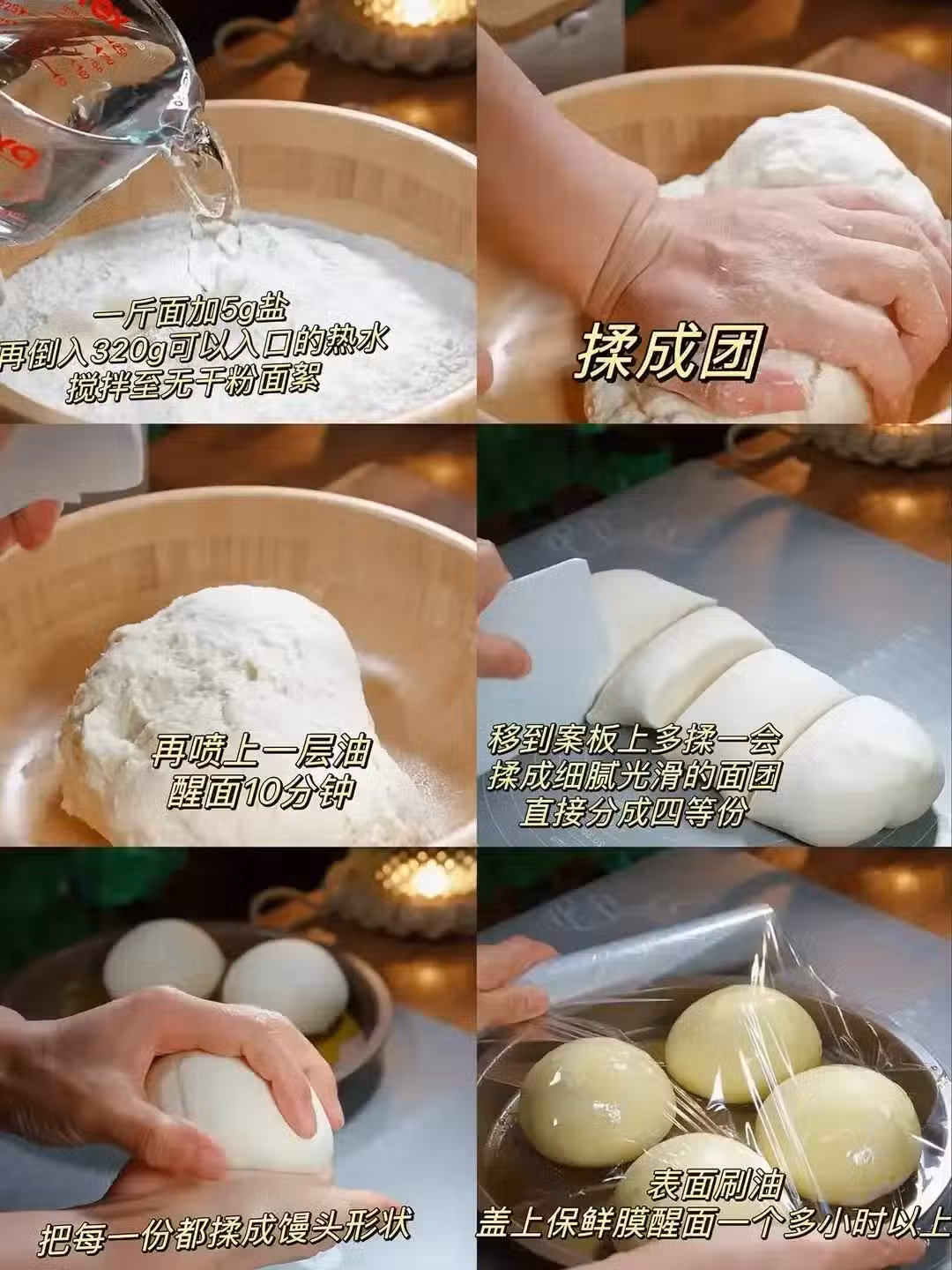 2、10分鐘後,將醒好的麵糰移到撒了薄粉的案板上,多揉一會兒,直到麵糰變得光滑細膩,仿佛嬰兒的肌膚一般。接著,用切刀將麵糰均分成4等份,每一份都揉成饅頭形狀,整齊地擺放在盤子裡。表面再抹上一層油,蓋上保鮮膜,讓麵糰再次醒發一個小時以上。這次的醒發至關重要,它能讓麵糰更加延展,為後續的擀制和層次分明的效果打下基礎。