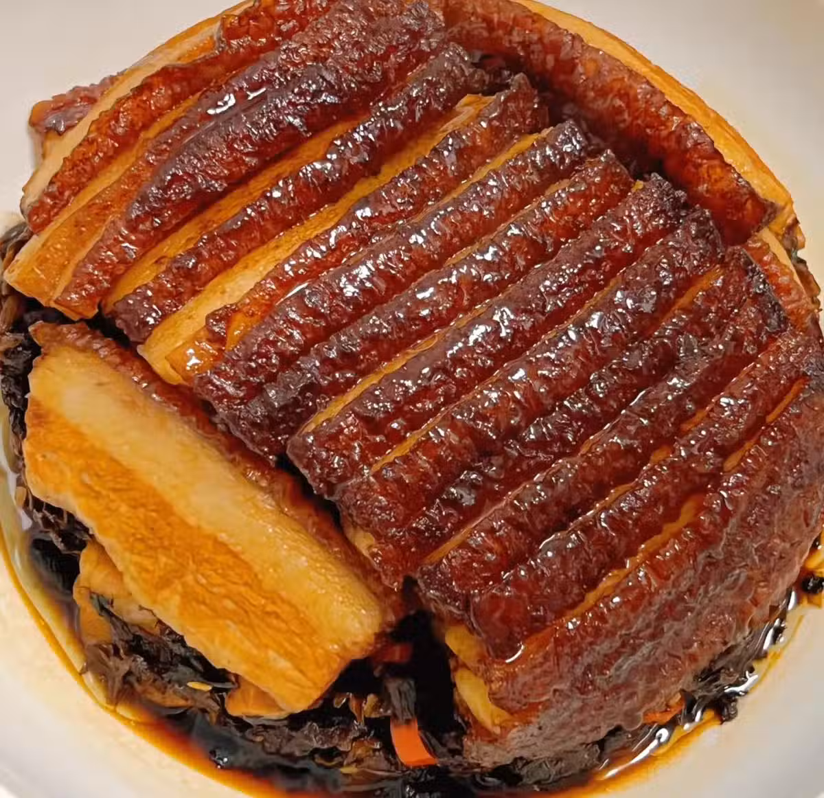 碎碎念:1.全程最危險的就是炸肉皮,一定要及時蓋蓋子,蓋子不夠重的話最好用手按壓著。 2.最起碼蒸一小時以上,要想肥肉入口即化就多蒸一會。 3.梅乾菜提前浸泡,清洗幾遍後攥干水,可以洗去泥沙防止太咸。