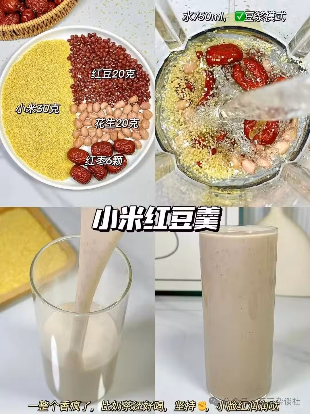這款豆漿喝起來香濃醇厚,完全不輸奶茶!小米養胃、紅豆排濕、花生滋潤、紅棗補氣,特別適合濕氣重、手腳冰冷的朋友。