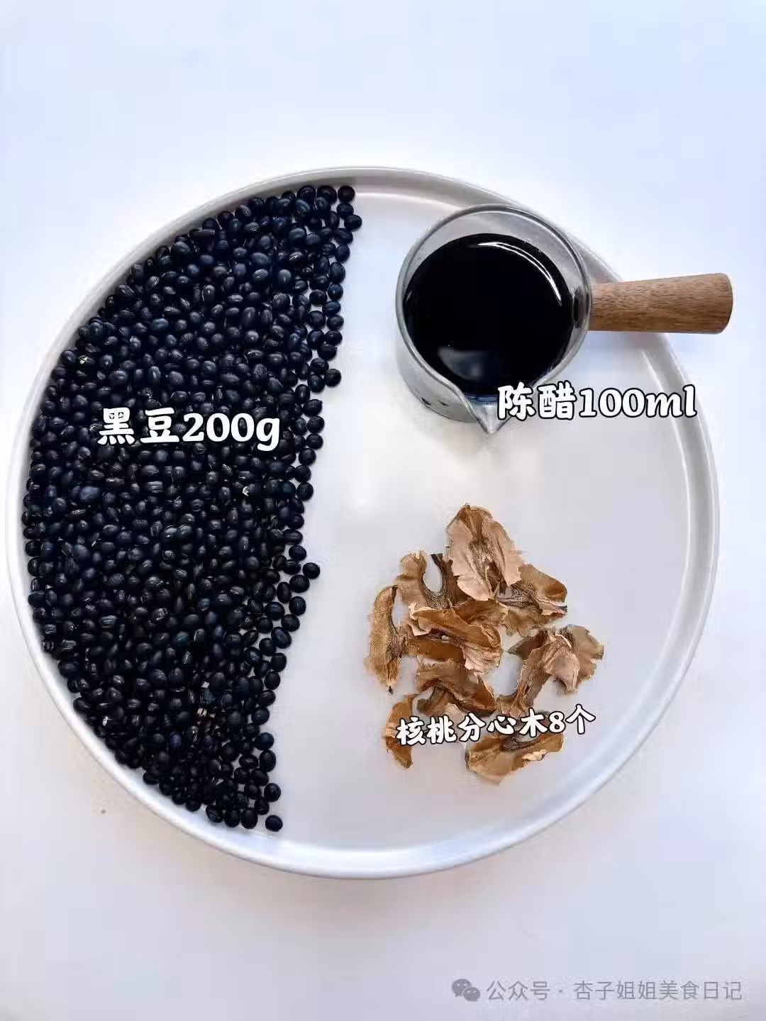 食材準備:黑豆200克、陳醋100毫升、核桃分心木8個