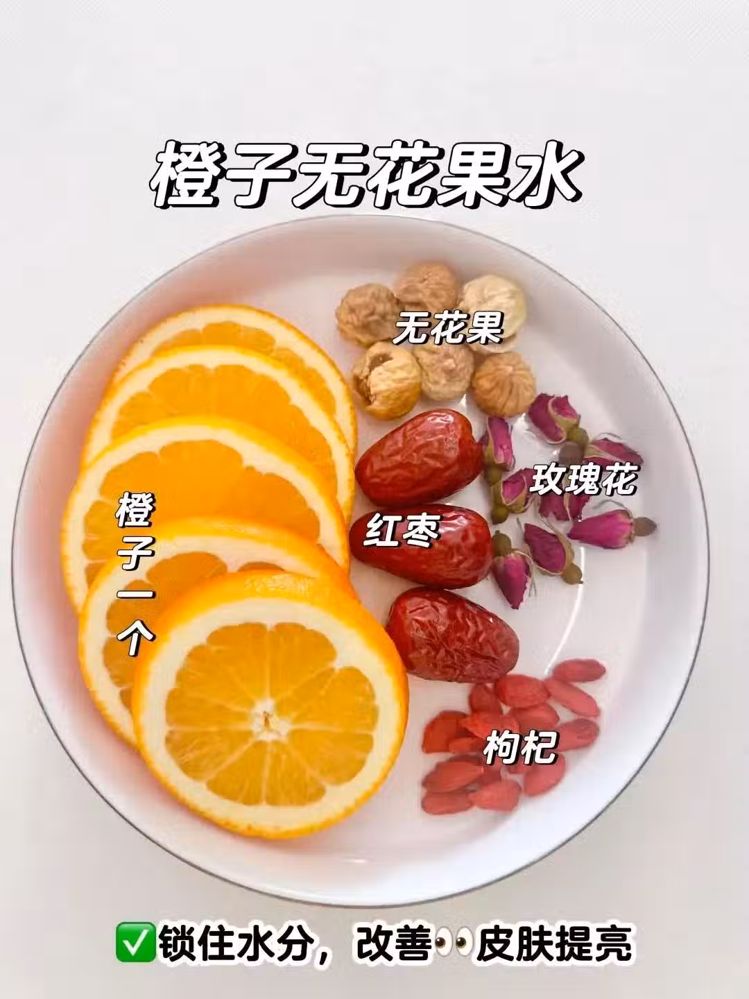 材料:橙子1個、無花果乾3-5顆、玫瑰花5-6朵、紅棗2顆、枸杞適量