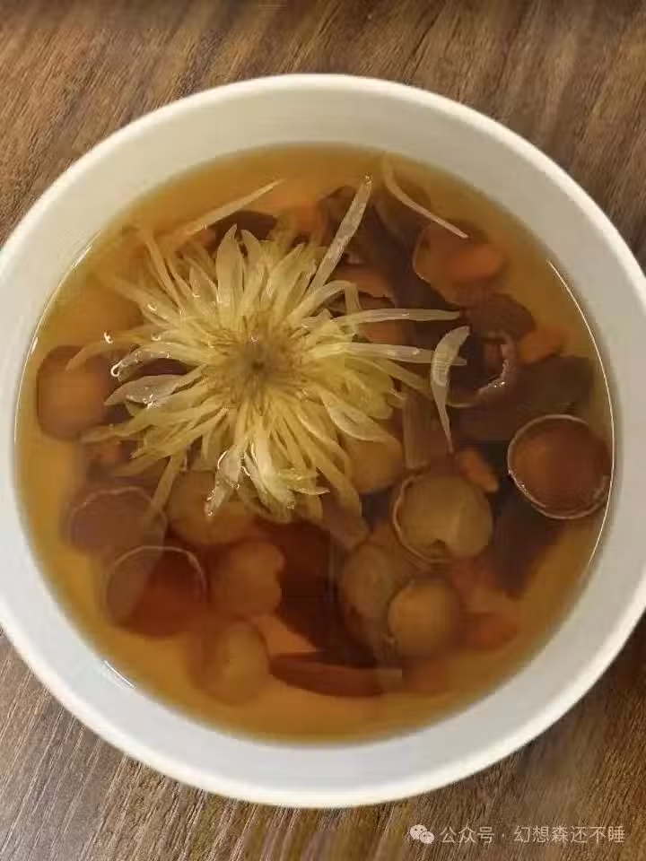 帶殼干桂圓6粒、紅棗4顆、枸杞子5g、菊花2朵