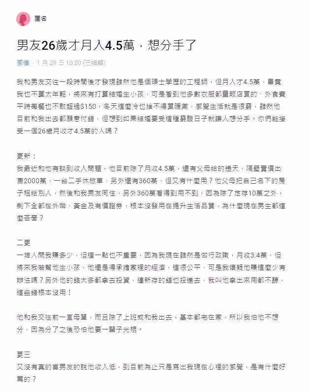 原PO也透露,自己目前從事行政職,月收3.4萬,「但這一點也不重要」,她覺得自己也不算太年輕了,將來會結婚生小孩,「他還是得承擔家裡的經濟,這很公平」,所以她質疑對方是不是無法負擔,「他的錢大多都拿去投資,連新存的錢也投進去,我叫他拿出來用都不聽,這些錢根本沒用!」