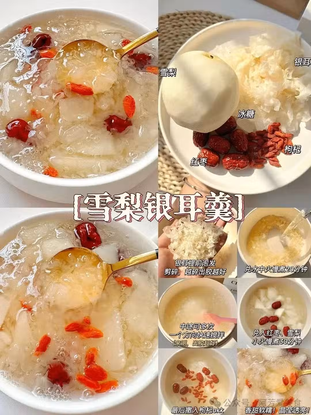 雪梨銀耳羹,簡直是潤到爆了,秋冬季乾燥的天氣就應該多喝一點雪梨銀耳羹。口感很好,水潤潤的。