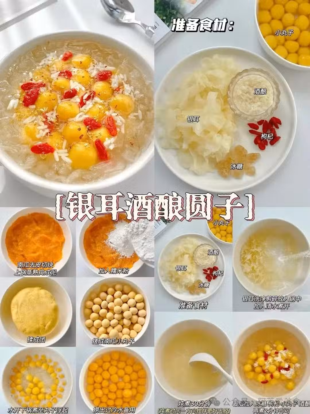 銀耳酒釀圓子,這款口感比較特別。因為加入了一些酒釀,所以口感會比較不一樣一點,也會更豐富一點噢。圓子是南瓜味的,軟糯可口。