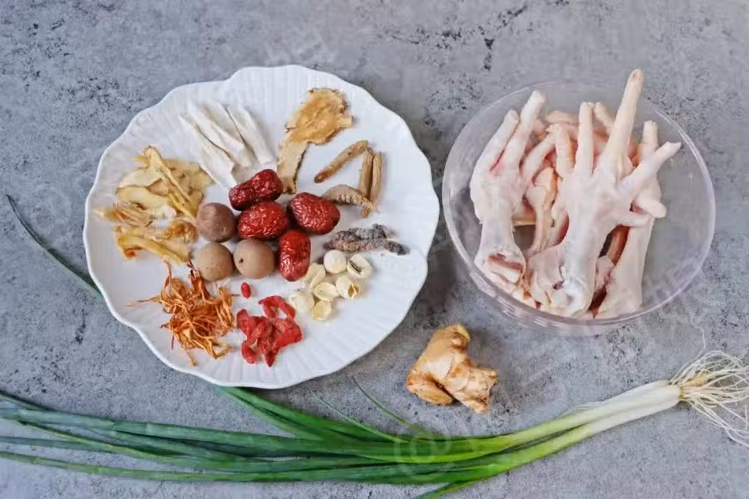 雞腳200克、黨參10克、黃芪10克、桂圓10克、紅棗5顆、當歸5克、玉竹5克、枸杞3克、生薑1塊、香蔥1根