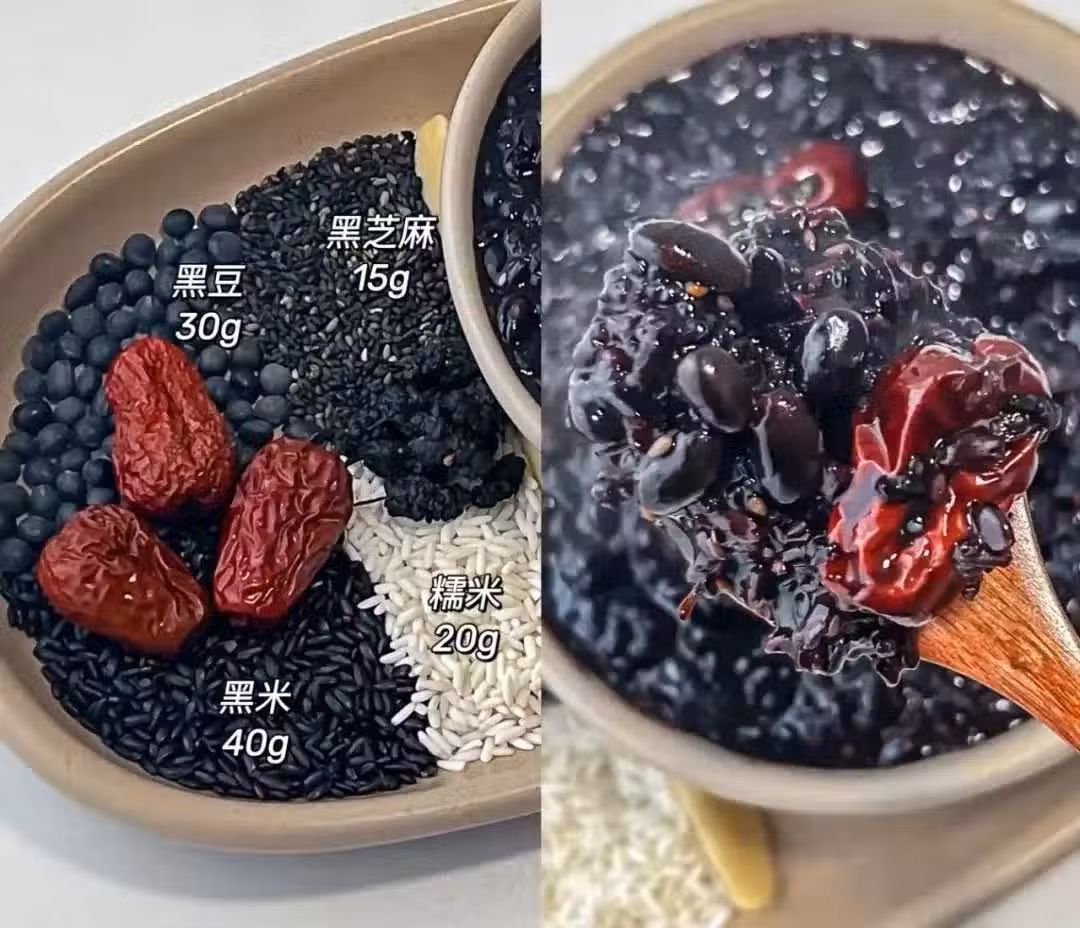 養生功效:黑米、黑豆和黑芝麻,這「三黑」組合被稱為女性的養發神器!黑色食材入腎經,能補腎護髮,搭配紅棗,香氣撲鼻,喝完感覺頭髮都有了光澤!