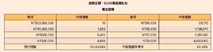但還是需要提醒民眾,雖然2000元刮刮樂整體中獎率雖達69.33%,但需注意的是,有網友在Threads提醒,這個中獎率69.33%表示你刮出來有中獎,但因為這款刮刮樂「小獎」非常多,中獎金額是不是回本並不一定,若以實際「回本機率」來看其實僅約29.33%,建議民眾在享受刮刮樂樂趣時仍需適可而止:「2000元刮刮樂回本率是最低的,過年小賭怡情就好,但還是祝大家中大獎!」
