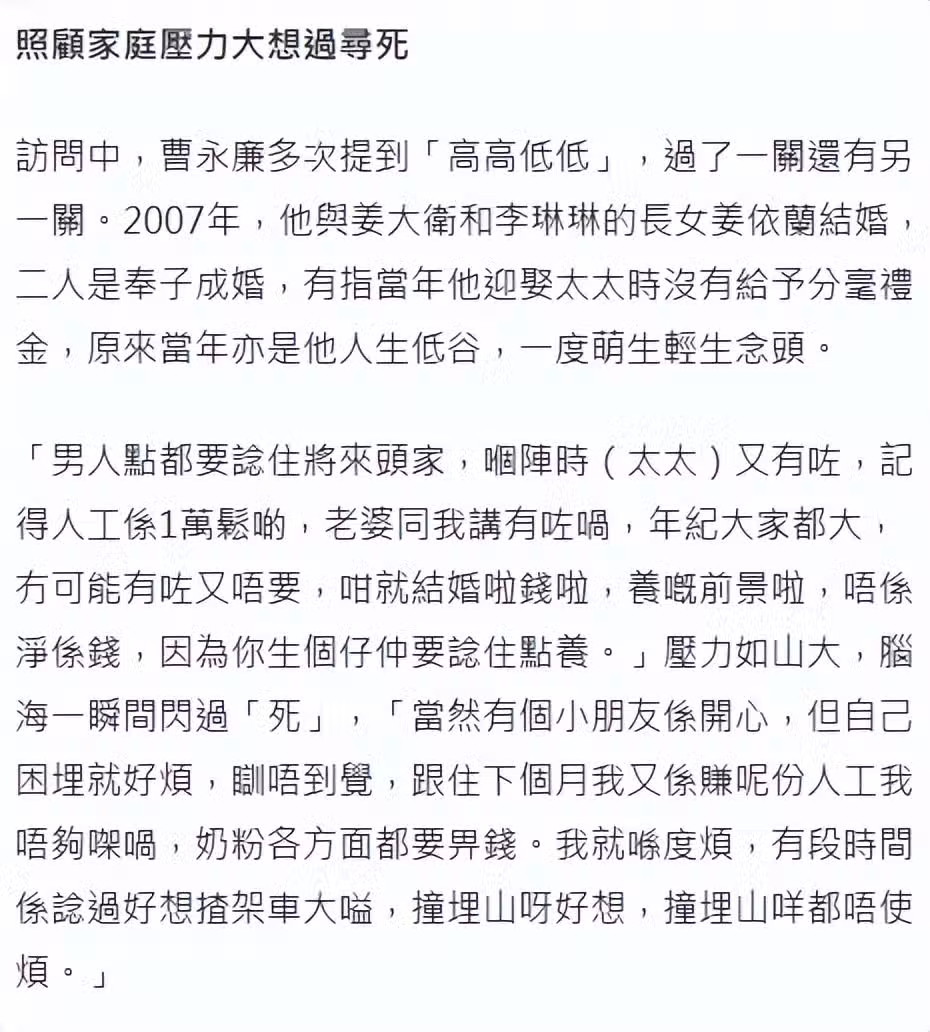 曹永廉的太太姜依蘭是姜大衛和李琳琳的愛女,兩人低調交往多年,2007年奉子成婚,在此之前,曹永廉不僅沒錢給彩禮,甚至還有十多萬的外債,一時間陷入兩難,聽到太太說「有了」,心煩意亂無法入眠,因為自己的工資根本不夠養小孩,有時候開著車都想往大山撞去。