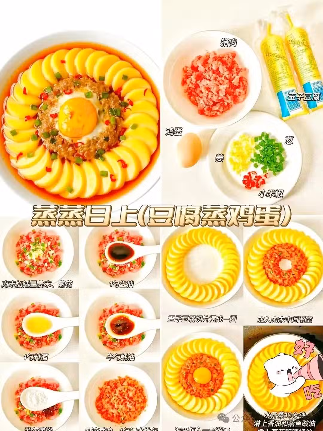 豆腐蒸雞蛋寓意蒸蒸日上,這樣的特別它的口感會非常的清爽,也不會很膩。豆腐和雞蛋的融合,再加入一些蒜末,簡直是好吃又美味。小孩和老人都愛吃!