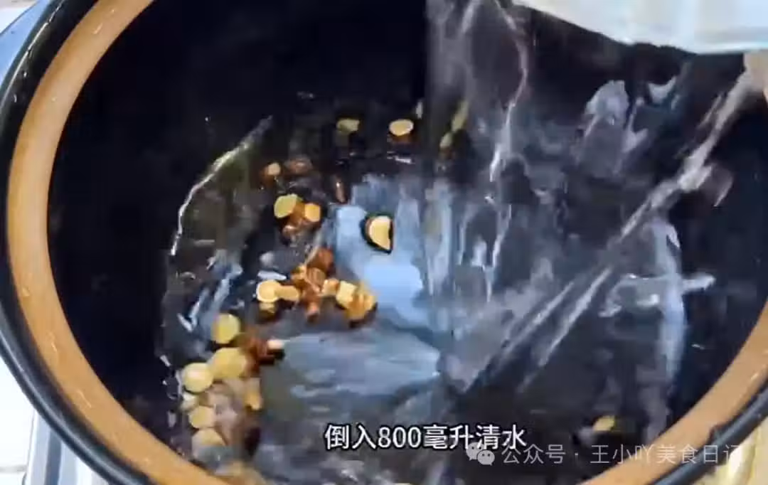 燉煮黃芪:準備一個砂鍋,將黃芪倒入,加入800毫升清水。大火燒開後,轉小火慢燉約10分鐘,讓黃芪的有效成分充分釋放到水中,湯色漸變為淡黃色。