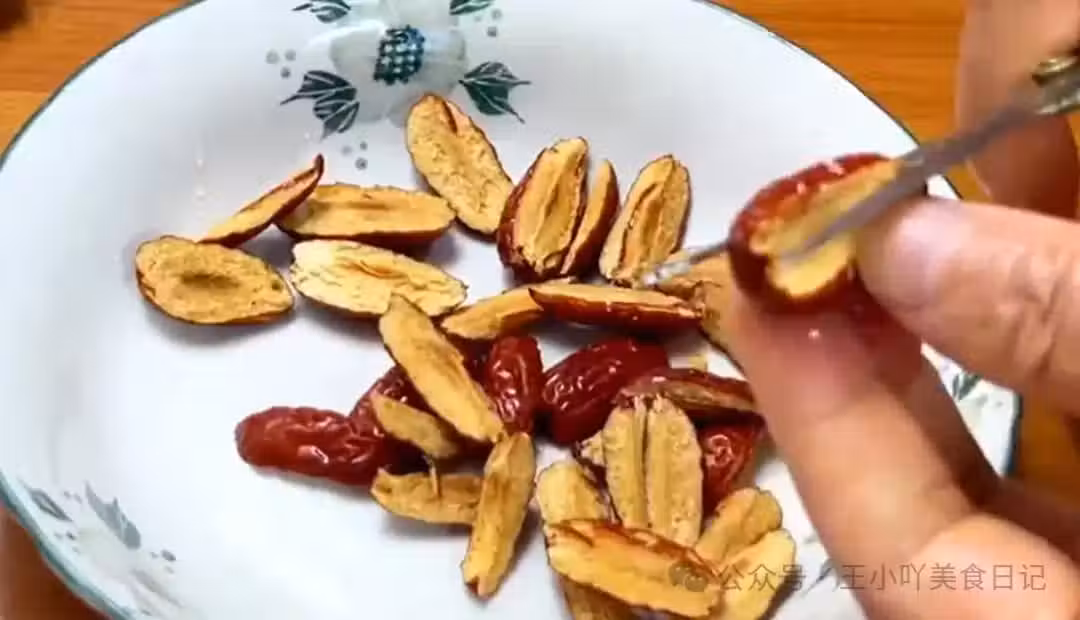 處理紅棗與蘋果:在等待黃芪燉煮的同時,將紅棗剪開去核,備用。蘋果切成適口大小,注意去除蘋果核,因為蘋果核含有微毒成分。蘋果易氧化,所以儘量在準備下鍋前再切。