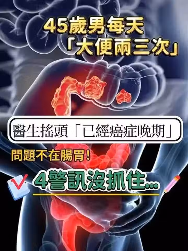 才45歲!他每天「大便兩三次」以為消化好,醫生搖頭「已經癌症晚期」四異常沒注意…