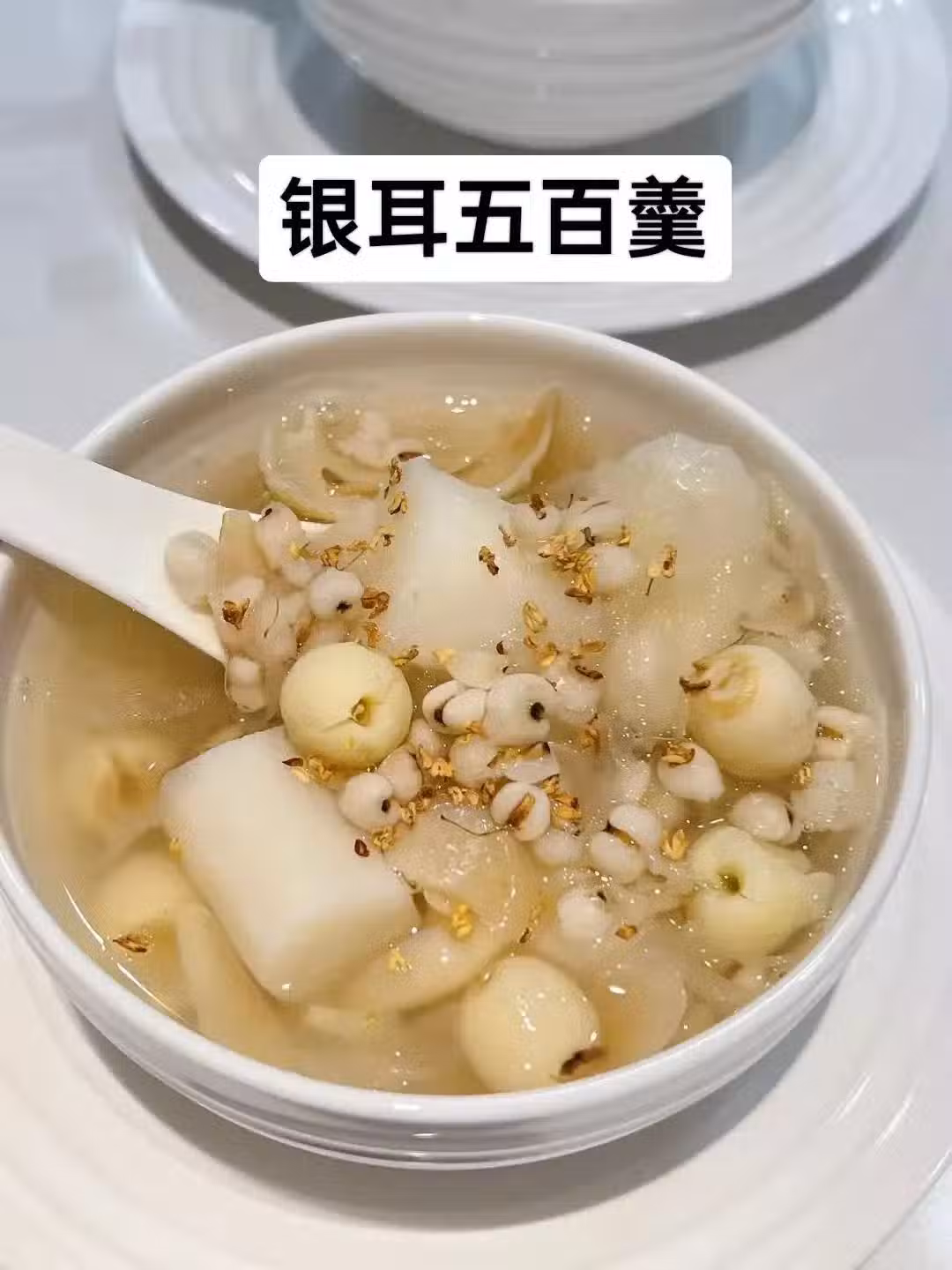 銀耳五白羹是秋冬季節很好的滋潤羹湯。彙集了銀耳、蓮子、百合、薏仁、山藥等一眾白色食物,簡直不要太滋潤了。