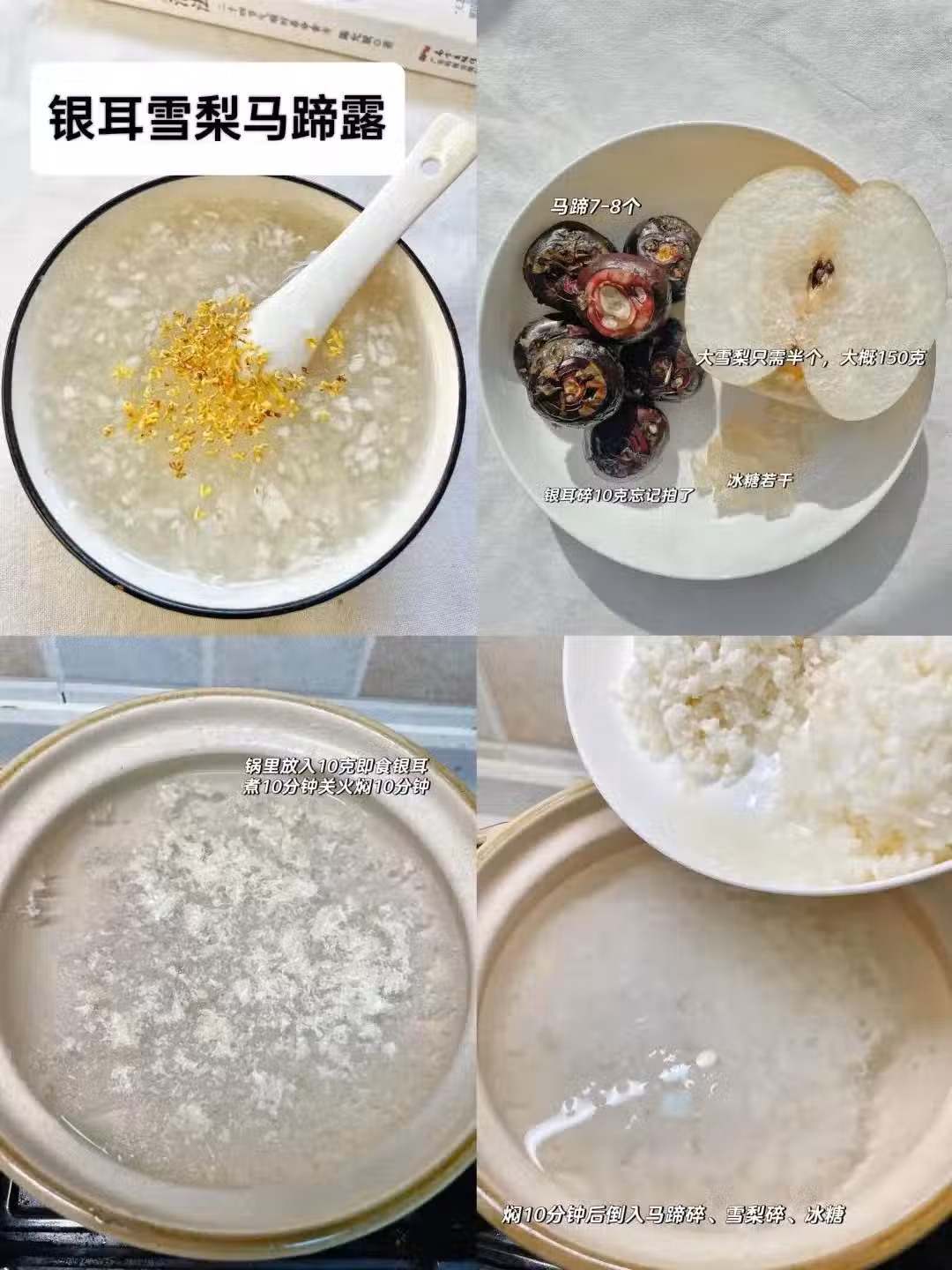 雪梨1個、馬蹄6個、冰糖少許、銀耳10g