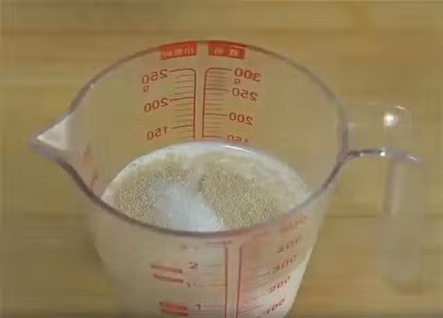 1.準備200毫升的牛奶,稍微加熱一下,別太燙哦,溫熱就行,然後往裡面放三克酵母粉和一勺白糖,攪一攪,讓酵母粉和白糖都化開,這樣咱們的酵母水就準備好了,是不是超簡單?