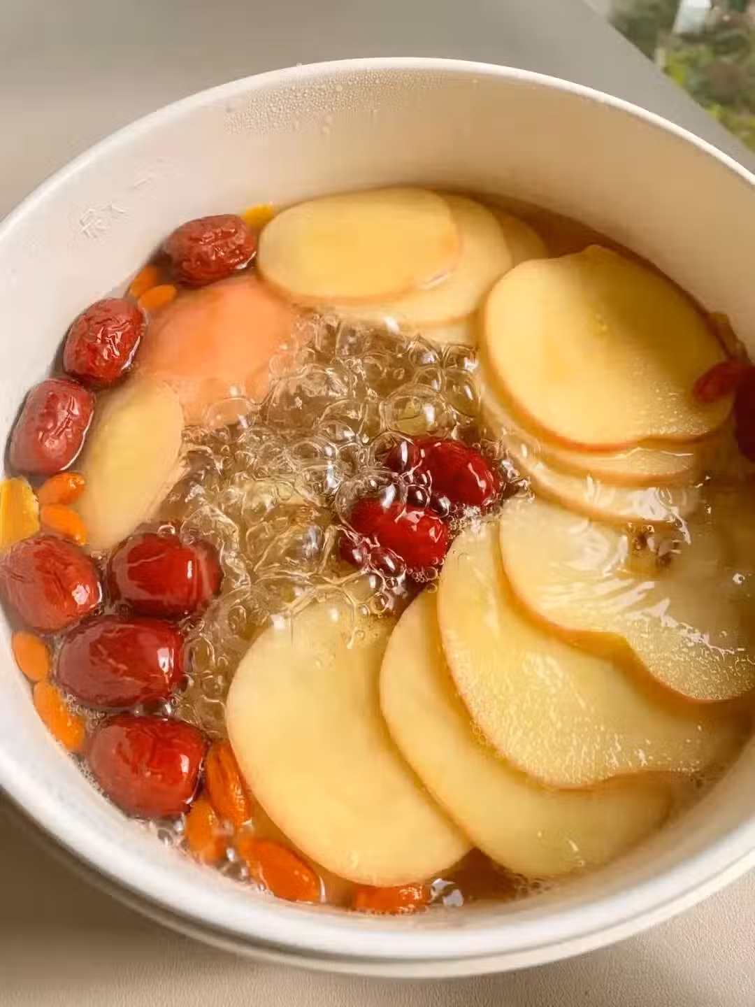 💖具體做法: 蘋果和姜切片,全部食材洗凈放入鍋中兌水煮開20分鐘即可