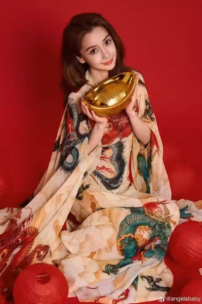 畫面中的她也穿著印有龍形圖樣和祥雲的服飾,色彩豐富且圖案精美,彰顯出濃厚的中國傳統文化韻味。她的雙手捧起一隻金光閃閃的金元寶,在紅色背景的襯托下,更顯富貴喜慶。Angelababy的身旁還擺放著紅燈籠,營造出一種節日的氛圍,傳遞出吉祥、富足的美好寓意。