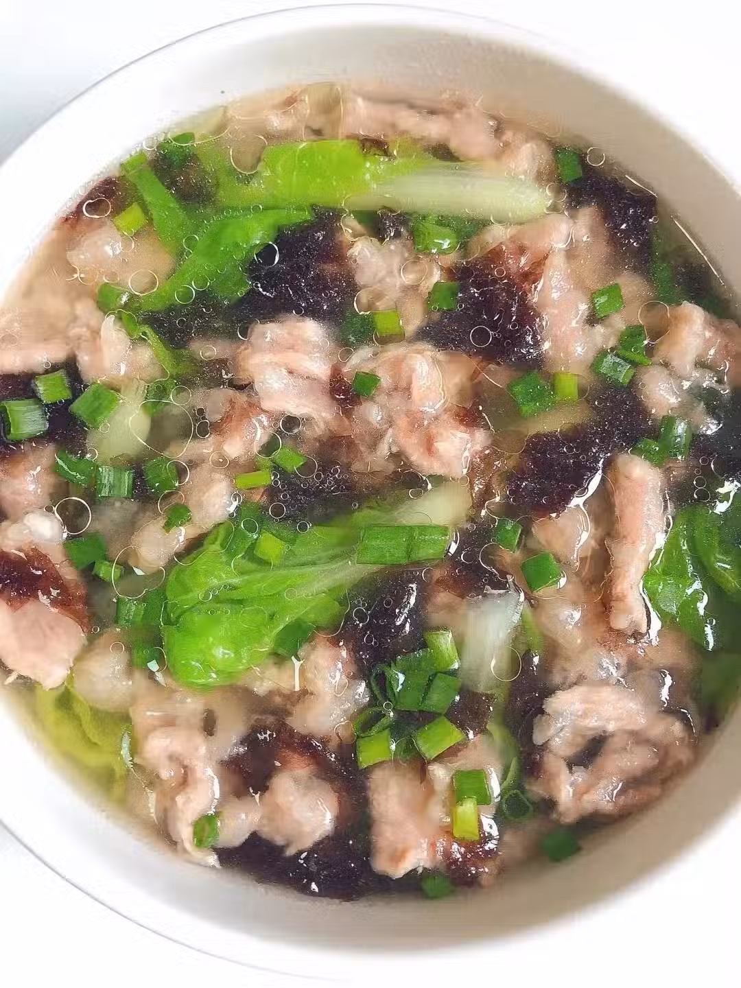 2:碗中準備少量紫菜,鍋中燒水,水開後轉小火均勻下入肉片,轉中火煮兩分鐘後下入青菜,加一點鹽,青菜煮好即可起鍋