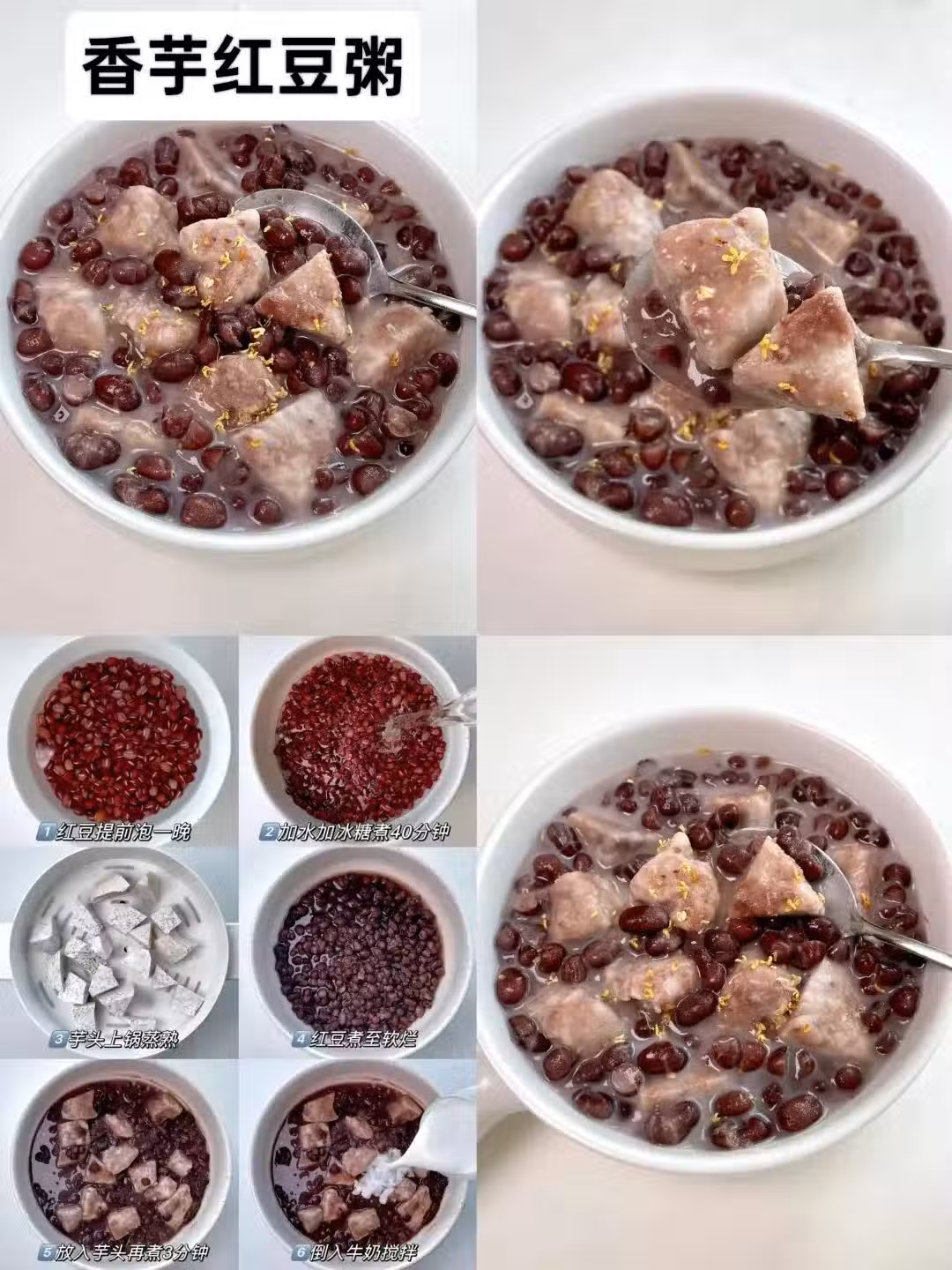 芋頭切塊上鍋蒸25分鐘蒸熟,紅豆提前浸泡加水煮到開花;紅豆、芋頭和冰糖混合再煮幾分鐘分鐘,加牛奶攪拌均勻即可。