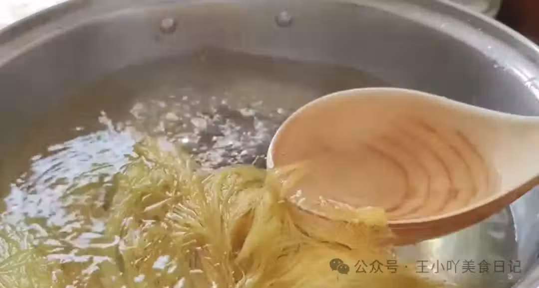 煮制過程:此時,鍋中的玉米須已經煮好了,湯汁的顏色變深,說明玉米須的營養已經完全溶入在水中。用筷子將玉米須打撈出來,棄之不用。