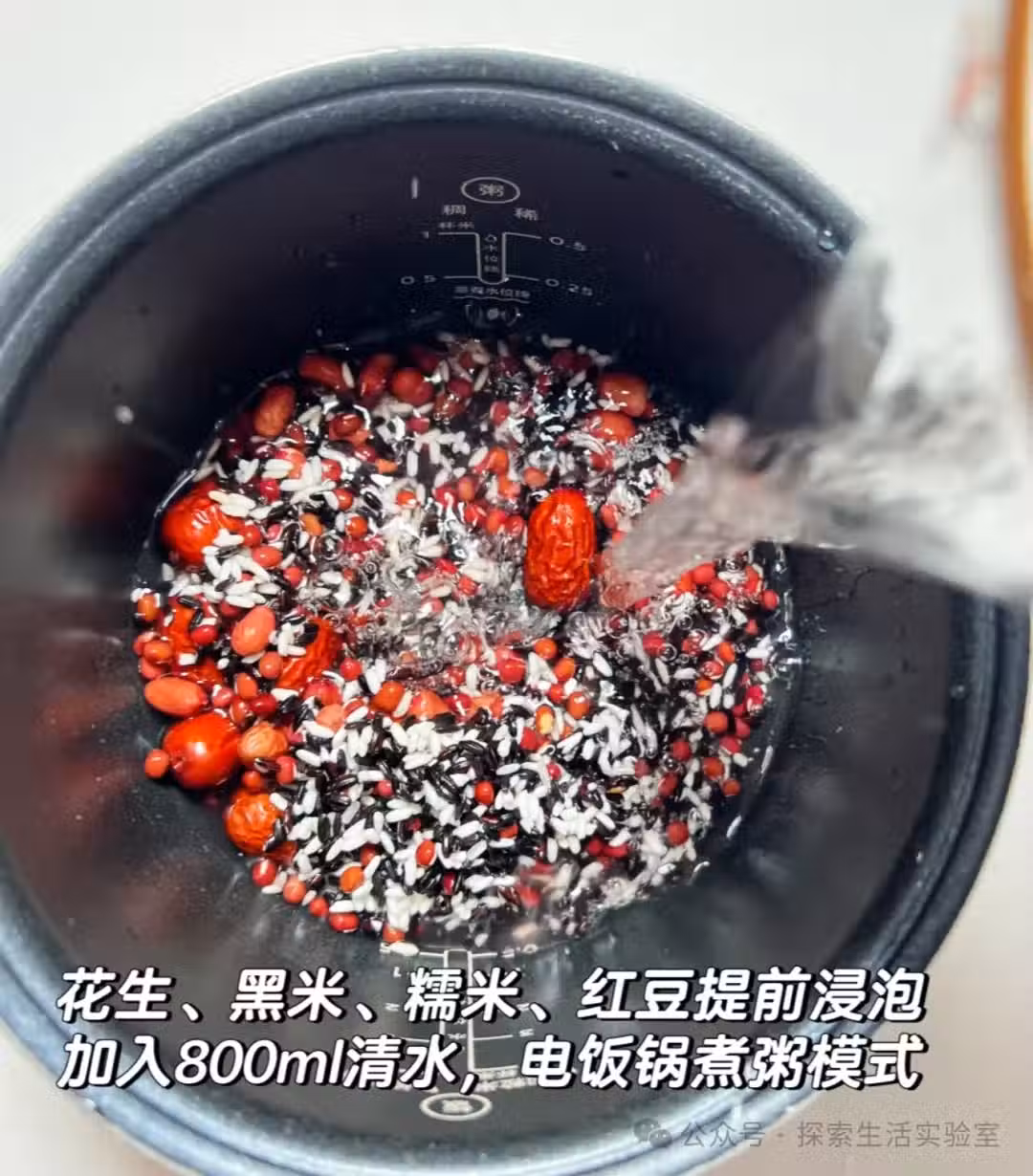 紅豆、紅棗、桂圓、花生、枸杞這五種紅色食材都有補氣血的功效,搭配糯米和黑米,既能補充營養,又能使粥更加濃稠美味,口感香甜軟糯~ 📒飲用小貼士: ①由於食材里比較多偏滋補,因此體內濕熱較重、舌苔厚膩、容易長痘或便秘的姐妹不宜過量食用,以防加重濕熱。 ②糖尿病患者食用時,要控制紅棗、桂圓等含糖量高的用量,或諮詢醫生後食用,避免血糖波動。