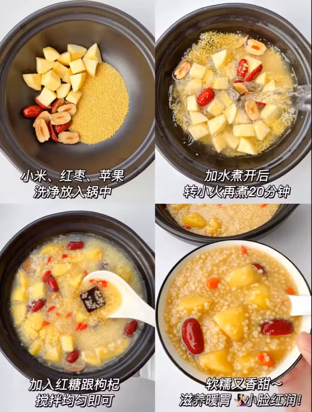 蘋果富含有維生素和果膠,有助於消化和補充營養; 小米健脾和胃,紅棗和紅糖補血益氣, 這道粥口感清甜,具有補血養顏,健脾和胃的功效 📒飲用小貼士: ①小米養胃,但是胃寒嚴重的姐妹,在煮的時候可以適當加點薑片一起煮,這樣可以增強暖胃的效果。 ②小米在淘洗時不要過度地揉搓,以免營養流失。 04、五紅粥